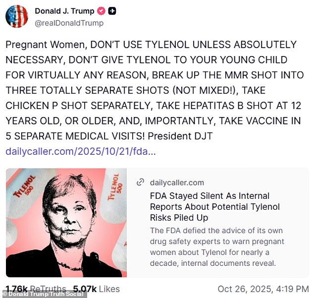 Trump’s post included a link to a story that accused the Food & Drug Administration of having ‘stayed silent as internal reports of potential Tylenol risks piled up.’