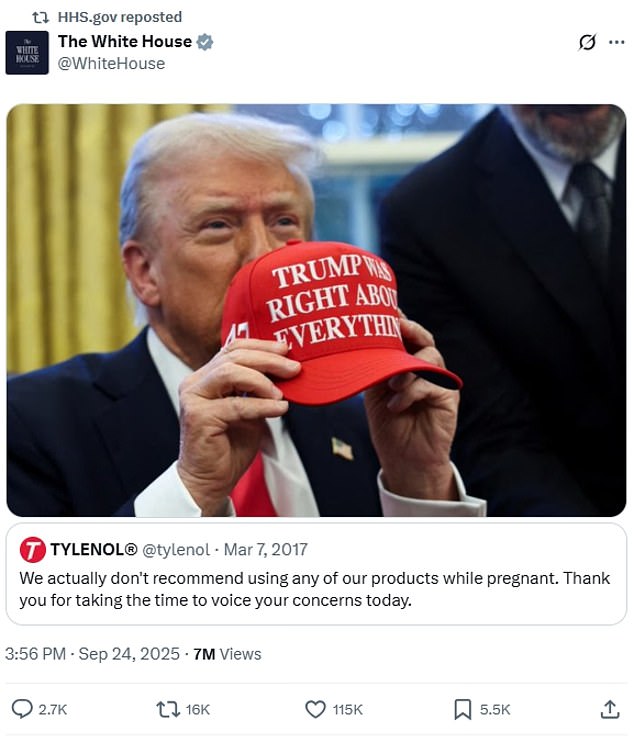 Tylenol faced further controversy when the White House’s X account reposted a March 7, 2017 post from Tylenol that read: ‘We actually don’t recommend using any of our products while pregnant. Thank you for taking the time to voice your concerns today.’