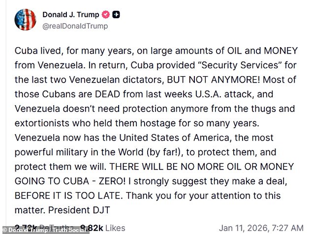 ‘Most of those Cubans are DEAD from last weeks U.S.A. attack, and Venezuela doesn’t need protection anymore from the thugs and extortionists who held them hostage for so many years,’ he continued.