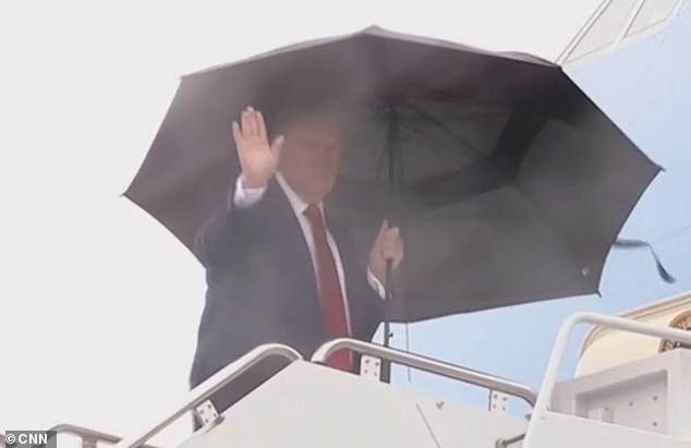 Trump addressed reporters just before he boarded Air Force One as he stood beneath an umbrella that shook in the powerful wind