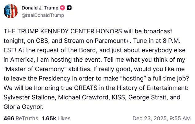 In one post, Trump announced the broadcast of the Kennedy Center honors, while in another, he discussed his ‘wonderful telephone calls’ with Kassym-Jomart Tokayev, the President of the Republic of Kazakhstan, and Shavkat Mirziyoyev, the President of the Republic of Uzbekistan.