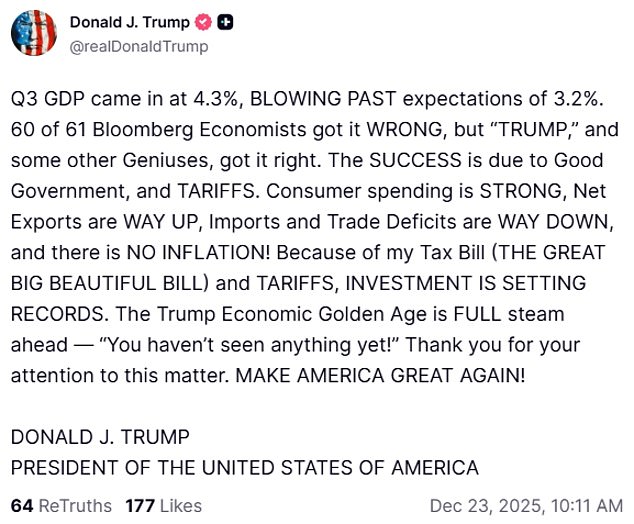 In the post, Trump credited tariffs for what he described as strong US economic performance, writing: ‘The TARIFFS are responsible for the GREAT USA Economic Numbers JUST ANNOUNCED… AND THEY WILL ONLY GET BETTER!’