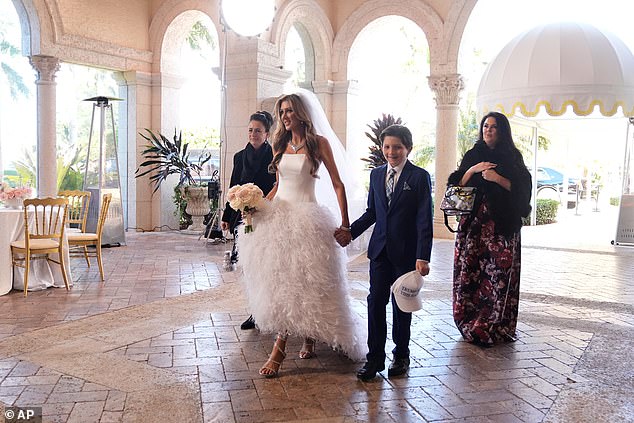 The blushing bride prepared herself for the ceremony, taking photos with friends and family. She was accompanied with a young boy, who held up a ‘Trump Made This Happen’ hat.
