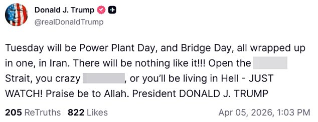 One of his more infamous posts came on Easter Sunday, when he declared: ‘Tuesday will be Power Plant Day, and Bridge Day, all wrapped in one, in Iran.’