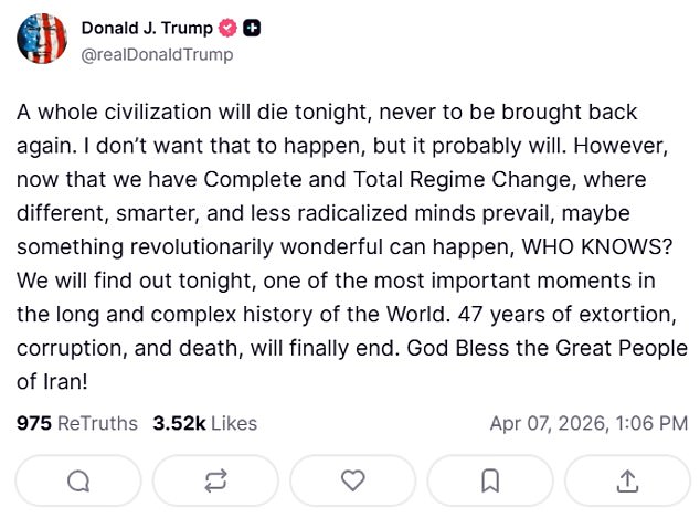 Two days later, Trump issued a chilling warning that caused even more backlash, threatening Iran that a ‘whole civilization’ would die if negotiations were unsuccessful.