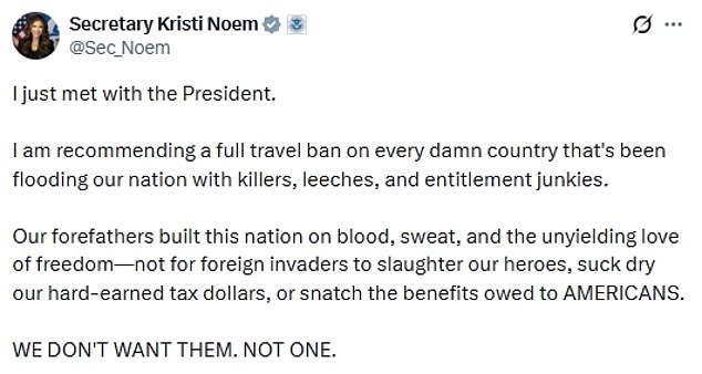 ‘I just met with the President. I am recommending a full travel ban on every damn country that’s been flooding our nation with killers, leeches, and entitlement junkies,’ Noem wrote on social media.