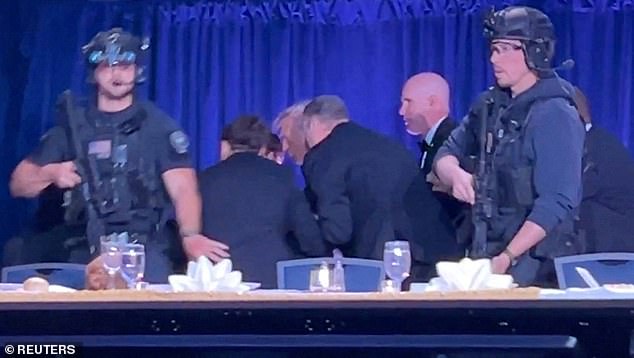 Most reporters had rushed over from the Hilton hotel which was hosting the dinner just over one mile away, with many still wearing their black tie and ball gowns from the ritzy gala.