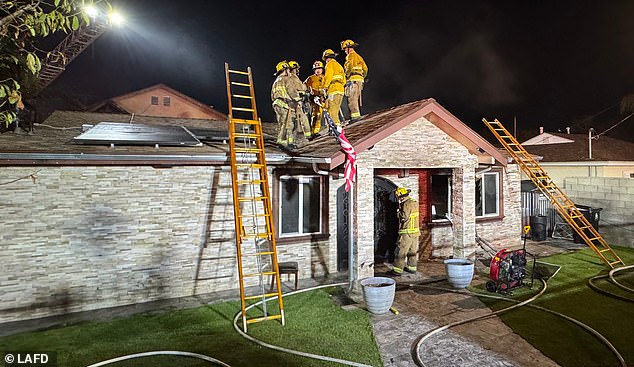 ‘With reports of additional occupants possibly trapped inside, firefighters initiated an interior fire attack while conducting a primary search,’ LAFD spokesperson Margaret Stewart said.