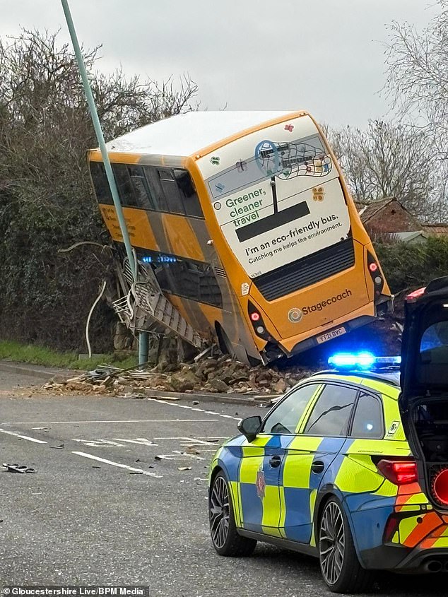 The Stagecoach bus veered off the road and ploughed into hedges as it struck a lamp post. One person from each vehicle was taken to hospital for assessment, Gloucestershire Police said.