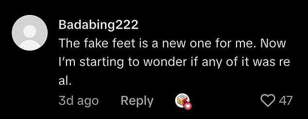 One of the most popular fan comments simply read: ‘The fake feet is a new one for me. Now I’m starting to wonder if any of it was real.’