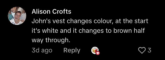 Another viewer pointed out a different mistake, adding: ‘John’s vest changes colour, at the start it’s white and it changes to brown half way through.’