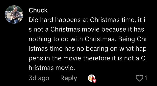 Fans wrote: ‘Die hard happens at Christmas time, it is not a Christmas movie because it has nothing to do with Christmas. Being Christmas time has no bearing on what happens in the movie therefore it is not a Christmas movie.’