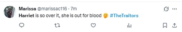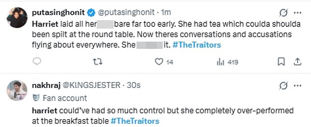 They posted on X: ‘Harriet laid all her s**t bare far too early. She had tea coulda shoulda been spilt at the round table. Now there’s conversations and accusations flying about everywhere. She’s f****d it.