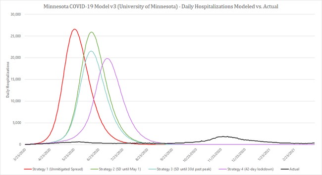 You see those three big lines in red, green, and purple? Those were the optimistic, medium, and pessimistic predictions from the model. Now look at the black line. That was reality.