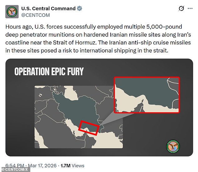 ‘Hours ago, U.S. forces successfully employed multiple 5,000-pound deep penetrator munitions on hardened Iranian missile sites along Iran’s coastline near the Strait of Hormuz,’ US Central Command said Tuesday night.