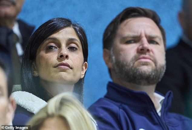 During a lengthy interview the second lady said she provides ‘meaningful input’ from the perspective of someone who loves him and wants him to succeed. Pictured, Vance is sworn in as US vice president in January 2025