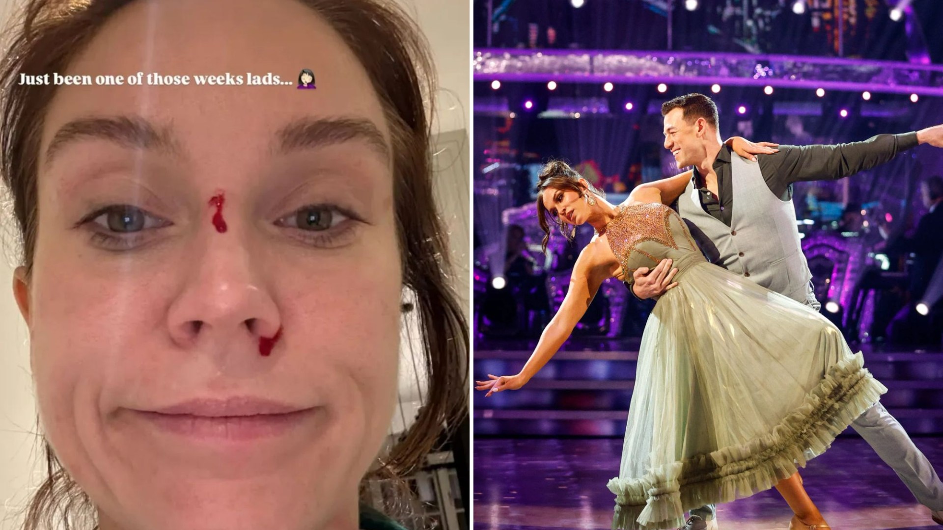But while she managed to overcome that, she’s gave the Strictly glam squad some extra work to do on Saturday ahead of Musicals Week after revealing her bloodied face.