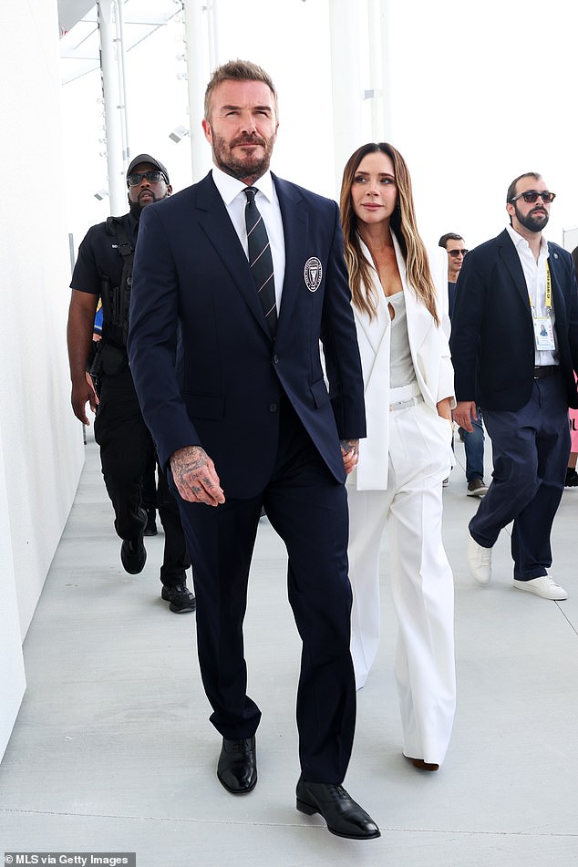 Victoria Beckham looked effortlessly chic in a white suit as she walked hand in hand with her husband David to the ribbon-cutting ceremony for his team’s new stadium.