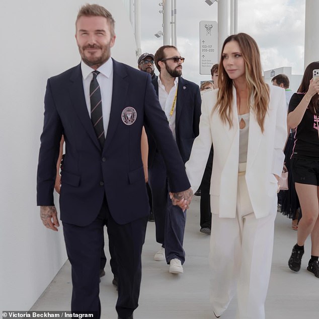 Victoria shared a snap of the family all posing together at the stadium, and another of her and David holding hands, with the fashion designer gazing lovingly at her beaming husband.