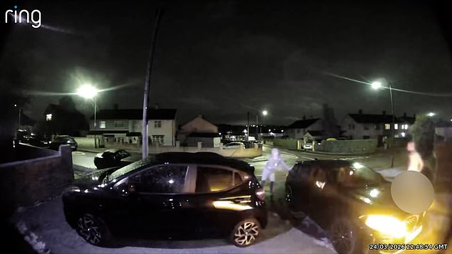 Just a day later, further Ring doorbell footage shows the assailants returning to smash front windows then repeatedly drive into the Thompson family’s cars parked outside their home in Conisbrough, South Yorkshire.