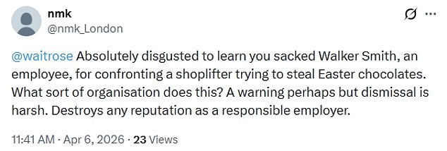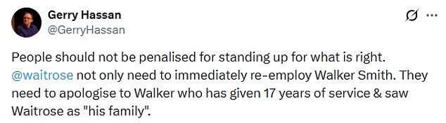 ‘People should not be penalised for standing up for what is right. @Waitrose not only need to immediately re-employ Walker Smith. They need to apologise to Walker who has given 17 years of service & saw Waitrose as “his family”,’ one wrote.