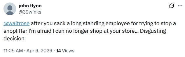 ‘After you sack a long-standing employee for trying to stop a shoplifter, I’m afraid I can no longer shop at your store… Disgusting decision,’ one customer wrote.