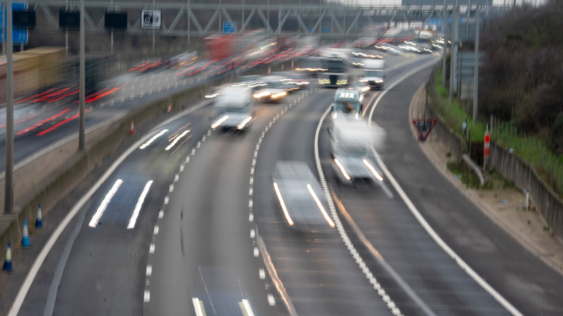 Blurred image of the M25 motorway with heavy traffic, showcasing light trails from vehicle headlights and taillights.