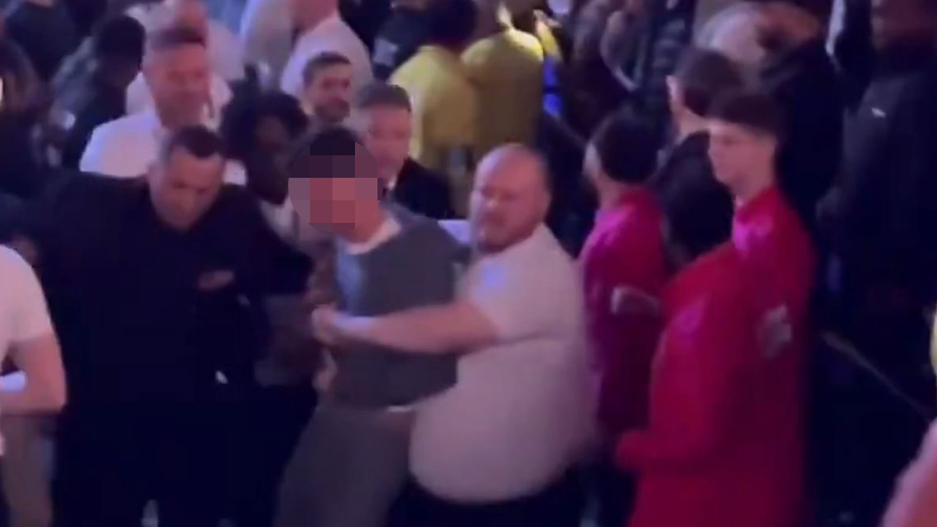 A group of individuals in the crowd can be seen pushing and shoving in a fast-growing melee.