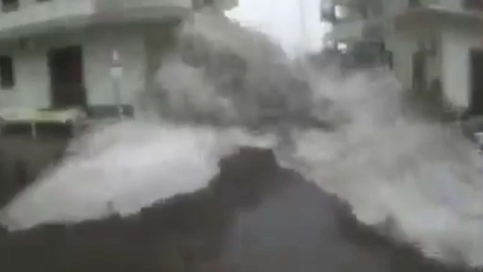 THIS is the moment a towering storm-surge wave smashes straight into the harbour at an Italian holiday island.