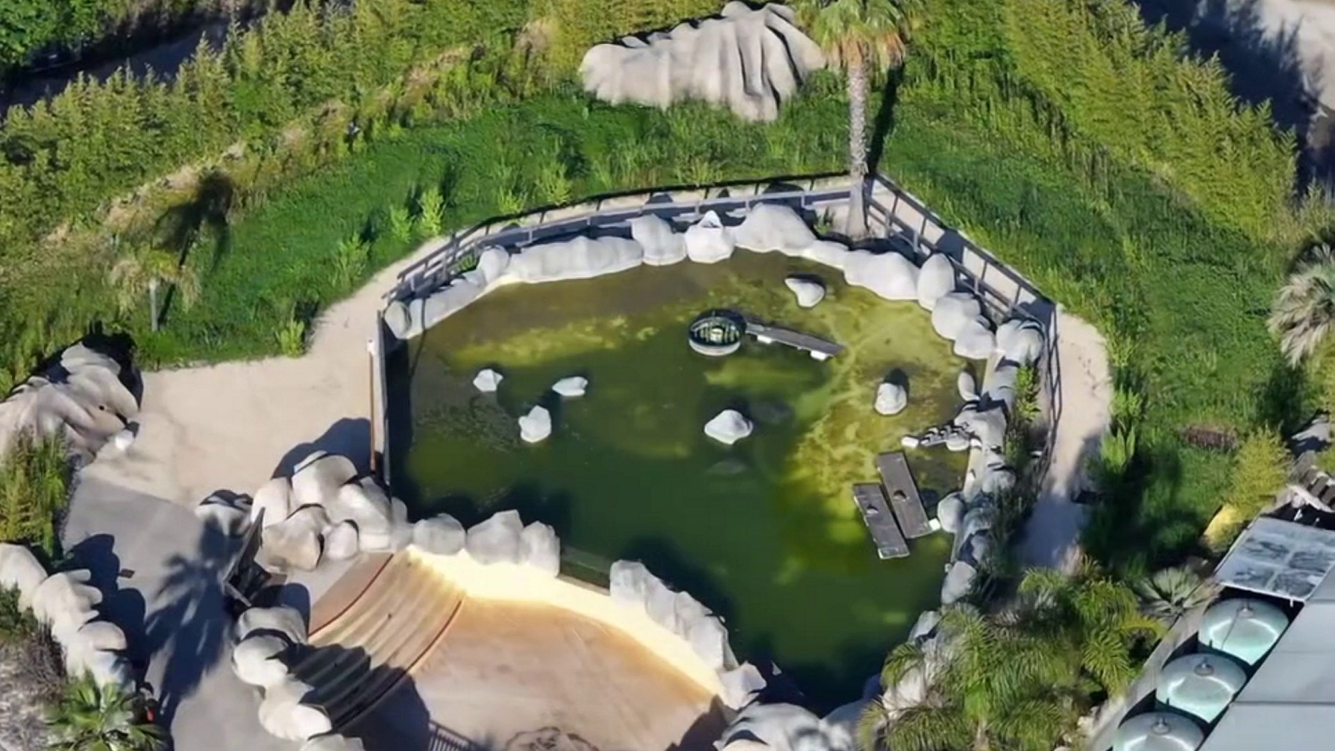 An aerial view of an abandoned marine park pool with algae-infested water.