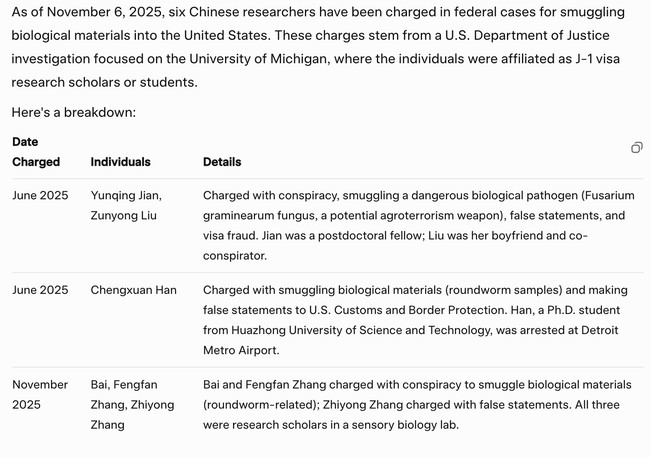“Allegedly attempting to smuggle biological materials under the guise of ‘research’ is a serious crime that threatens America’s national and agricultural security,” said Attorney General Pamela Bondi. “We will remain vigilant to threats like these from foreign nationals who would take advantage of America’s generosity to advance a malicious agenda.”