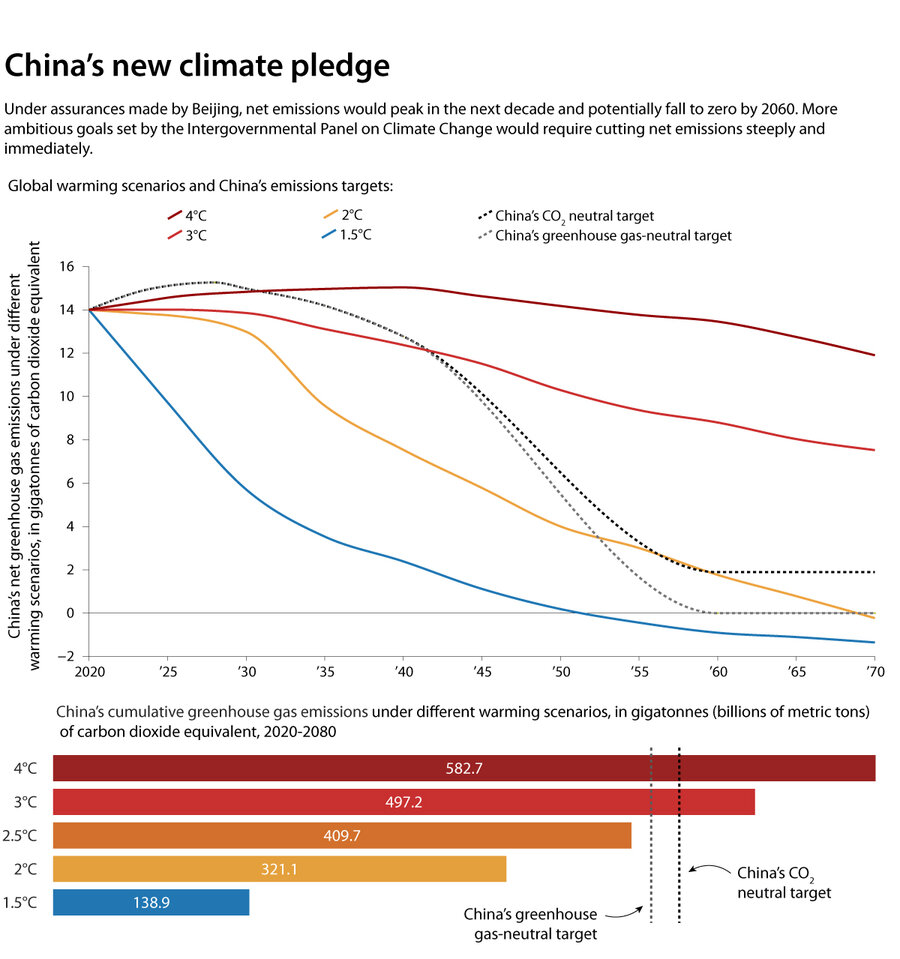 Nevertheless, experts say China’s commitment falls far short of the robust targets needed to fulfill the Paris Agreement imperative to limit the rise in global temperatures to less than 1.5 degrees Celsius.