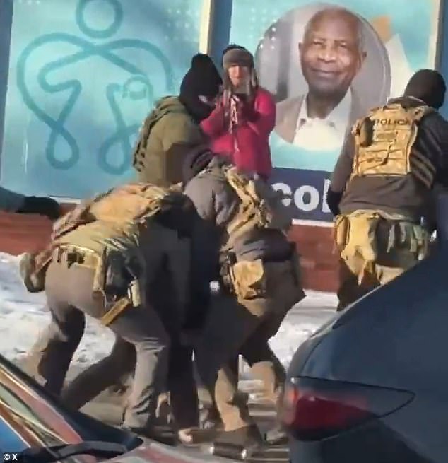 Multiple DHS agents are seen surrounding him, struggling to restrain his arms and legs as he is pushed face-down onto the pavement.