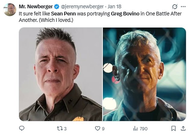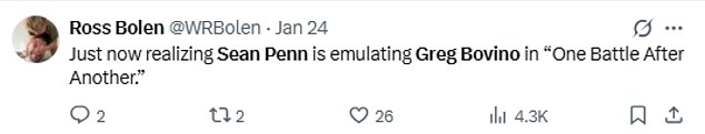 ‘Just now realizing Sean Penn is emulating Greg Bovino in “One Battle After Another.”’; ‘It sure felt like Sean Penn was portraying Greg Bovino in One Battle After Another. (Which I loved.)’