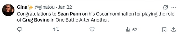 Taking to X/Twitter, viewers penned: ‘Congratulations to Sean Penn on his Oscar nomination for playing the role of Greg Bovino in One Battle After Another’;