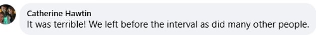 ‘My husband and I left at the interval. I have never left a show early, it was that bad,’ she told The Argus.