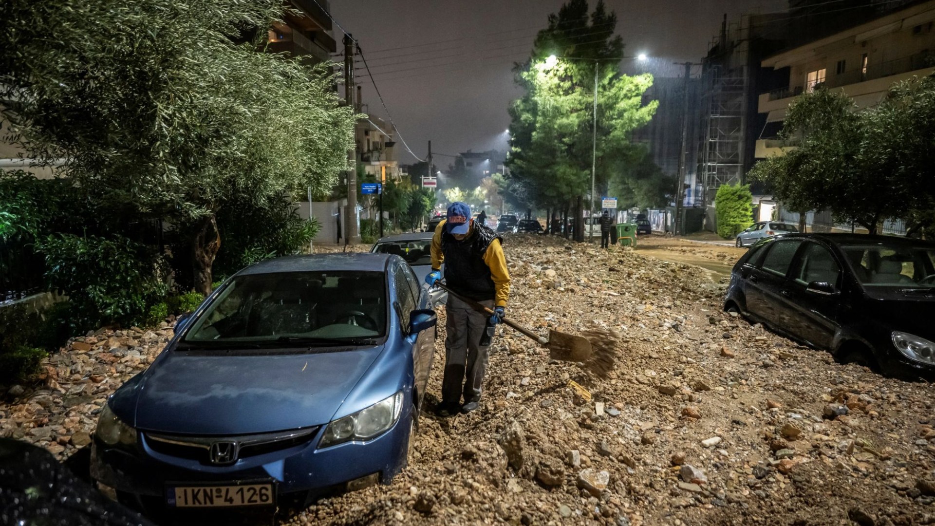 Local residents and emergency workers help clear up debris and dislodge cars in AthensCredit: Athena