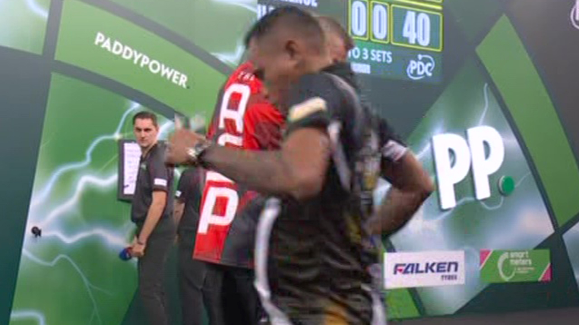 The wasp was seen hovering about as Filipino darts star Ilagan stepped back from a throw during the second game in the opening set.