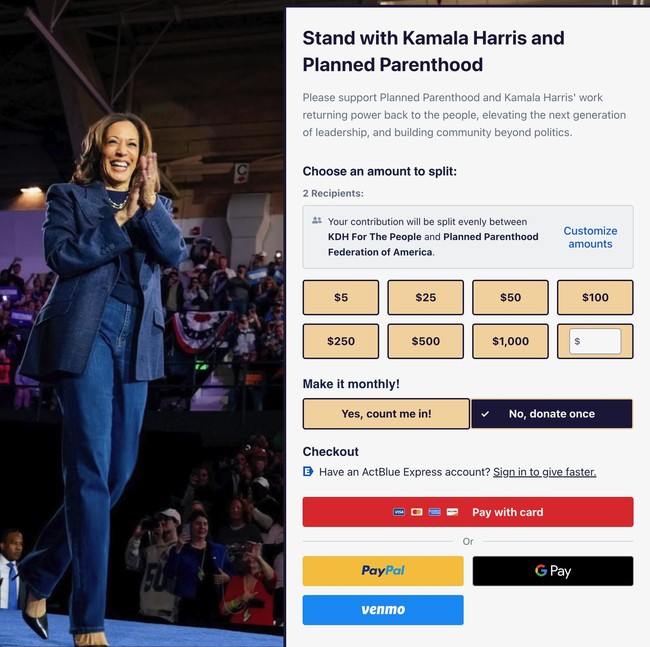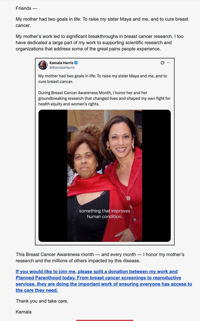 It’s not uncommon for groups to exchange email lists or share fundraising pitches, but there is absolutely no information about what Kamala Harris is raising money for. She’s basically monetizing her list for unspecified purposes, splitting the take with Planned Parenthood so she has an excuse to ask for money for a “good cause.”