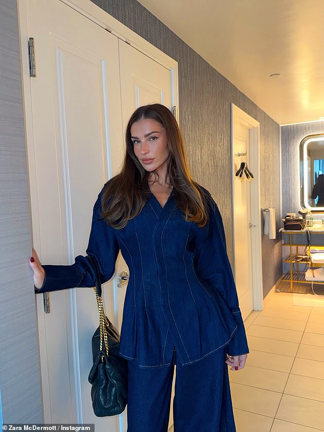 Posing up a storm in the hotel bathroom, the reality star showed off the cinched denim blazer and matching trousers co-ord she had worn to the F1