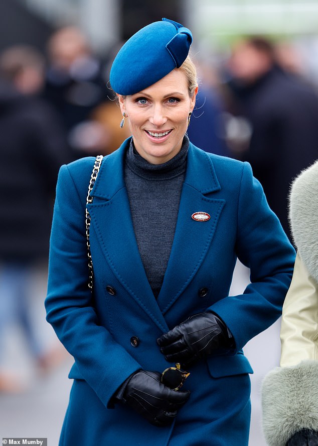 Zara Tindall wrapped up warmly in a striking blue coat as she braved the winter chill at Cheltenham Racecourse today