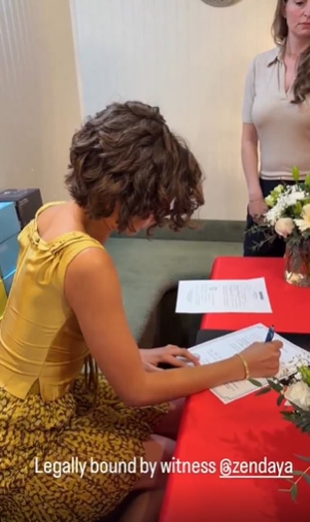 And as Zendaya signed the papers she joked: ‘last name reveal’ as she signed her signature for the couple.